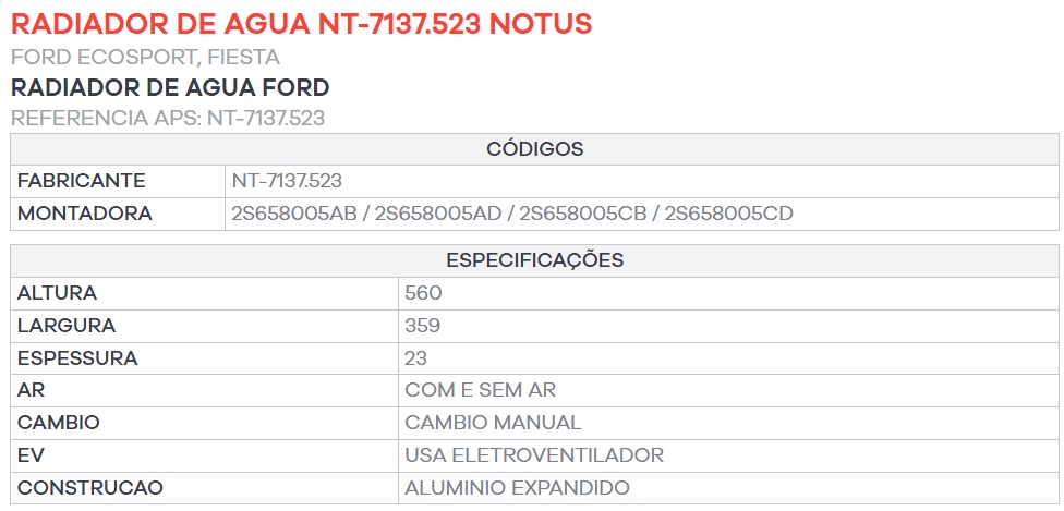- Radiador Ford Fiesta e Ecosport - 1.0 - 1.6 - 2003 a 2010 - Marca Notus - NOVO